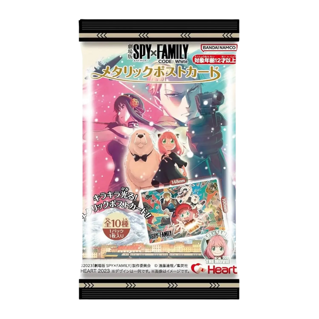Featuring a sleek metallic finish, the Bandai Namco SPY X FAMILY the Movie Metallic Postcard is a must-have collectible for fans of the beloved anime series. Crafted from high-quality resin, each postcard measures a standard size and showcases a vibrant design that emphasises the luxury and action of SPY X FAMILY: CODE White. Originating from Japan, these authentic postcards highlight iconic characters and scenes from the movie, making them perfect for display or trading with fellow enthusiasts. With its shimmering metallic sheen, this postcard lends a sophisticated touch to any collection. Use it as a decorative piece on desks or mount it in a picture frame to showcase your fandom, or gift it to a fellow anime lover to brighten their day. Whether for display or gifting, the SPY X FAMILY metallic postcard adds a distinctive and stylish element to your anime memorabilia.