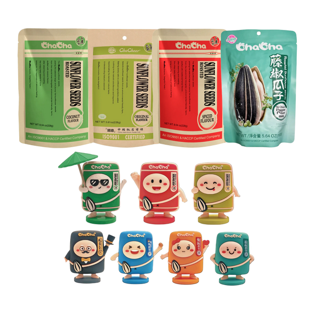 Enjoy a crunchy sunflower seed snack experience with a fun surprise. This ChaCha bundle brings together a range of popular sunflower seed flavours along with a mystery blind box item for an extra element of excitement.