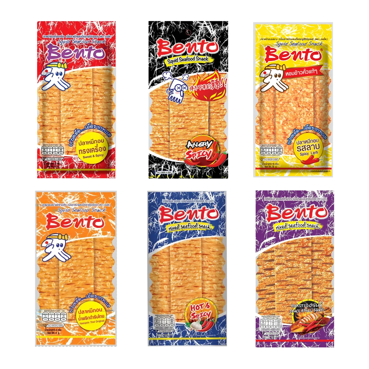 - 😡 Bento Squid Seafood Snack Angry Spicy 20g – One of the spiciest Bento flavours with an intense chilli punch.